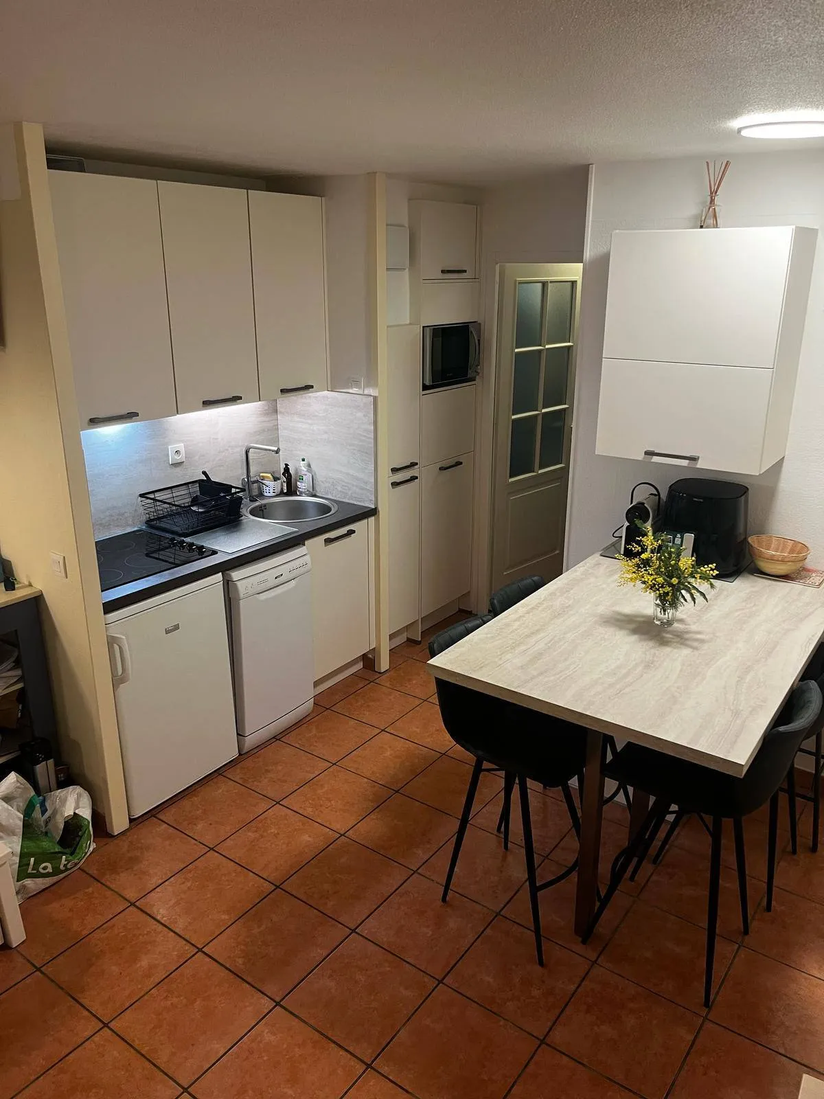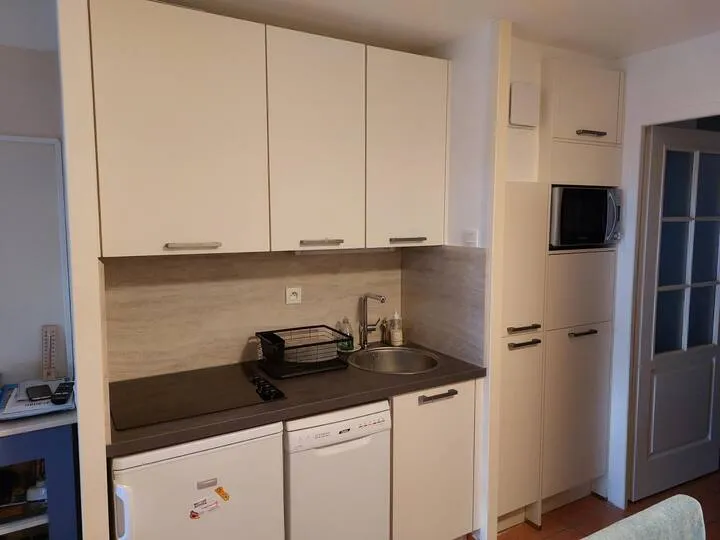- Coin cuisine équipé (plaques, frigo, micro-ondes)